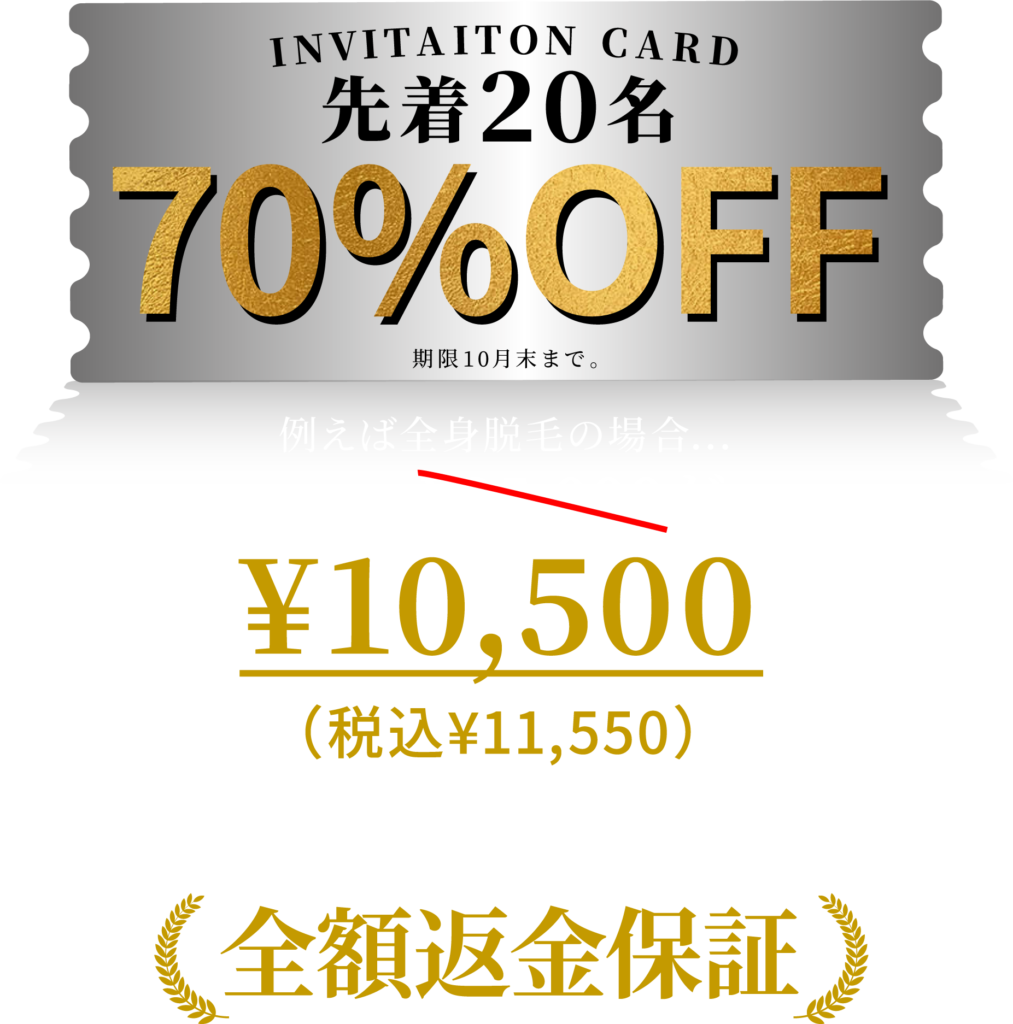 ※全額返金保証制度について【概要】効果を感じなかった方に手数料なしで施術代全額返金いたします【対象】特定の部位を3回以上施術いただいた方(1部位1回ずつ、計3回施術の場合は対象に含まれません)